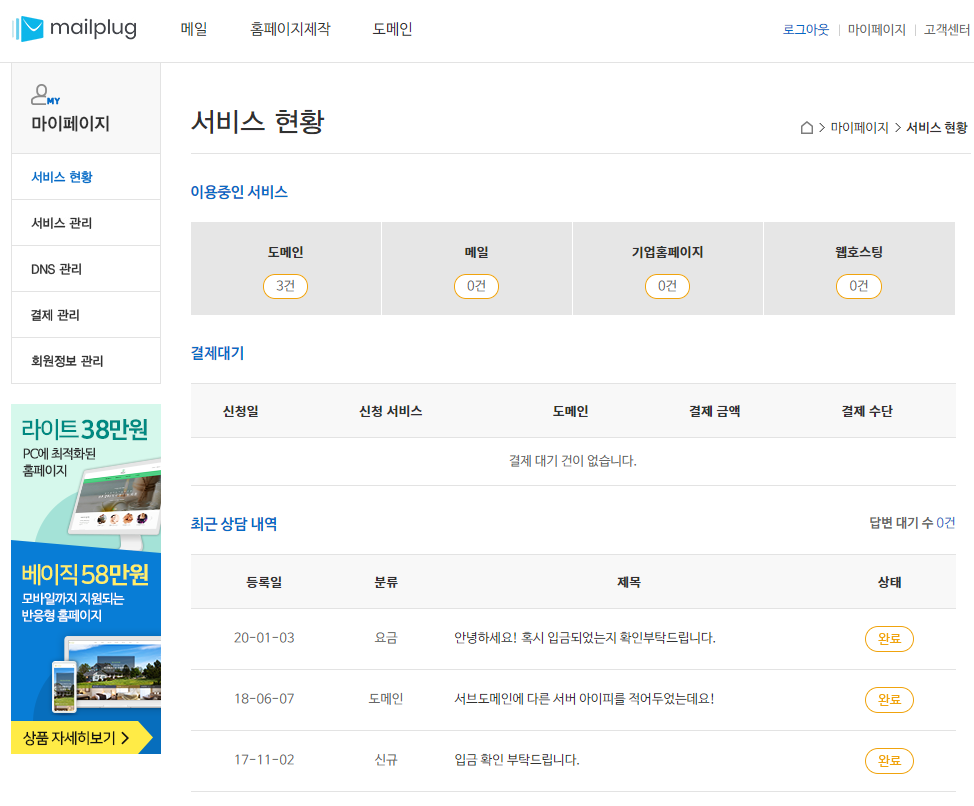 이렇게, 도메인을 구매한 내역이 있다면 이용중 서비스에 표기됩니다.
