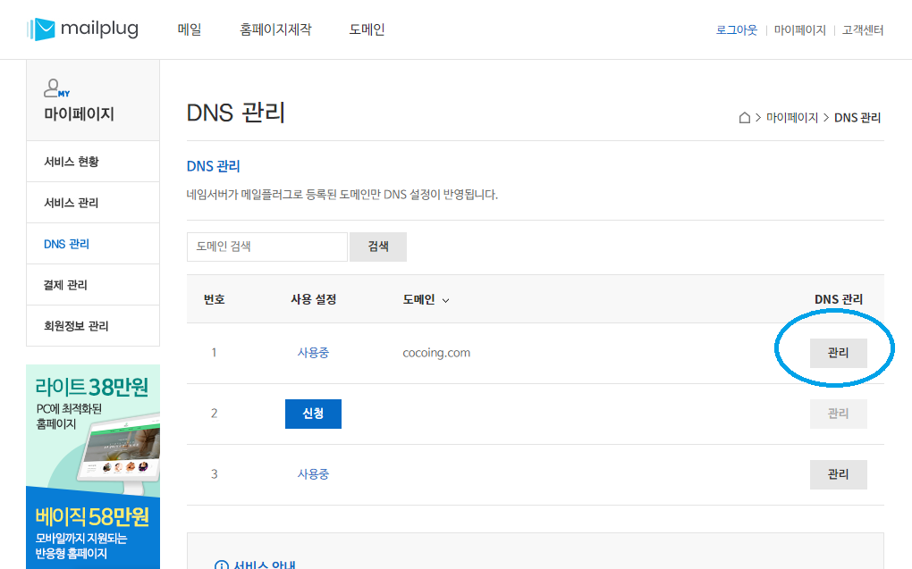 우리는 이용중인 서비스 도메인 1건을 눌러 들어가주세요. (제 화면에는 3건이라 써있긴 합니다)