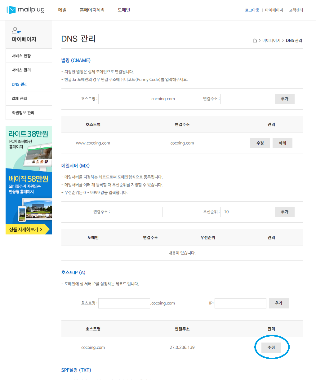 이렇게 네임서버를 메일플러그를 빌려 우리 블로그로 오게끔 설정작업을 진행합니다.