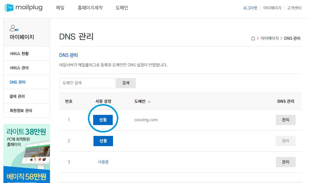 이렇게 신청 버튼이 활성화 된 것을 과감히 눌러주세요. 누르지 않으면 DNS관리 기능을 해당 도메인에서 사용할 수가 없어요.